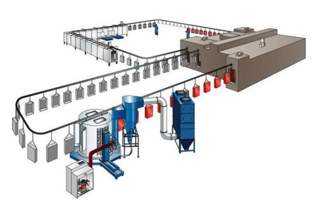 上件 →噴砂(或拋丸)→除塵 →靜電噴粉(含噴粉房、自動噴涂升降往復(fù)機、靜電發(fā)生器、靜電噴槍、粉桶、小旋風(fēng)/二級粉末回收裝置) →烘干固化(160℃-420℃) →冷卻 →下件